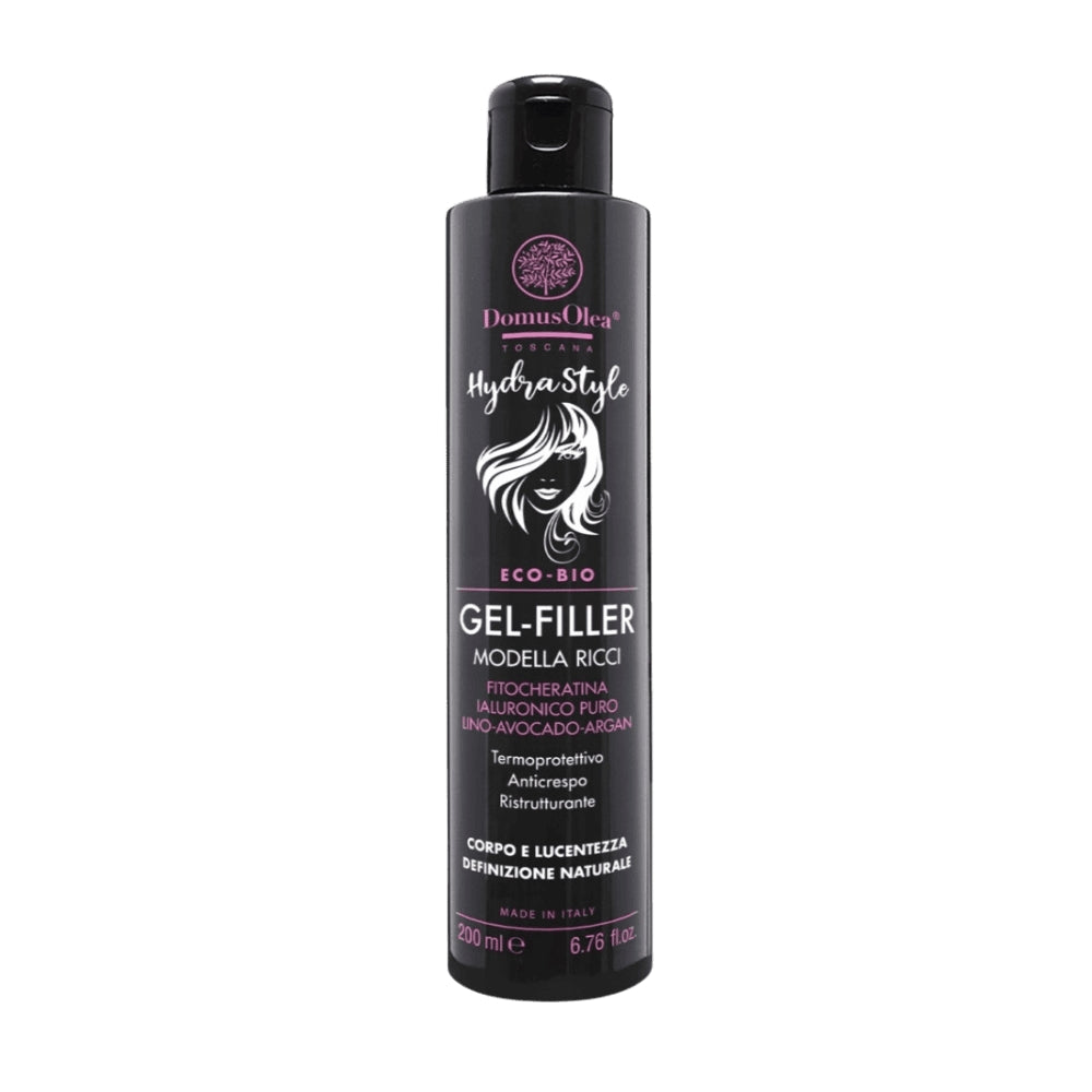 Hydra Style – Gel Filler Modella Ricci - Domus Olea Toscana è un gel modellante innovativo che combina azione styling e trattamento. Grazie a ingredienti funzionali come Fitocheratina, Acido Ialuronico Puro, Proteine di Grano, Soia e Mais, nutre e rinforza la fibra capillare, riempiendo le aree danneggiate e aumentando il diametro percepito del fusto (effetto filler). Il gel crea ricci definiti, morbidi e lucidi, con un effetto leggermente bagnato o naturale, proteggendo i capelli dal crespo e facilitando il restyling senza appesantire.